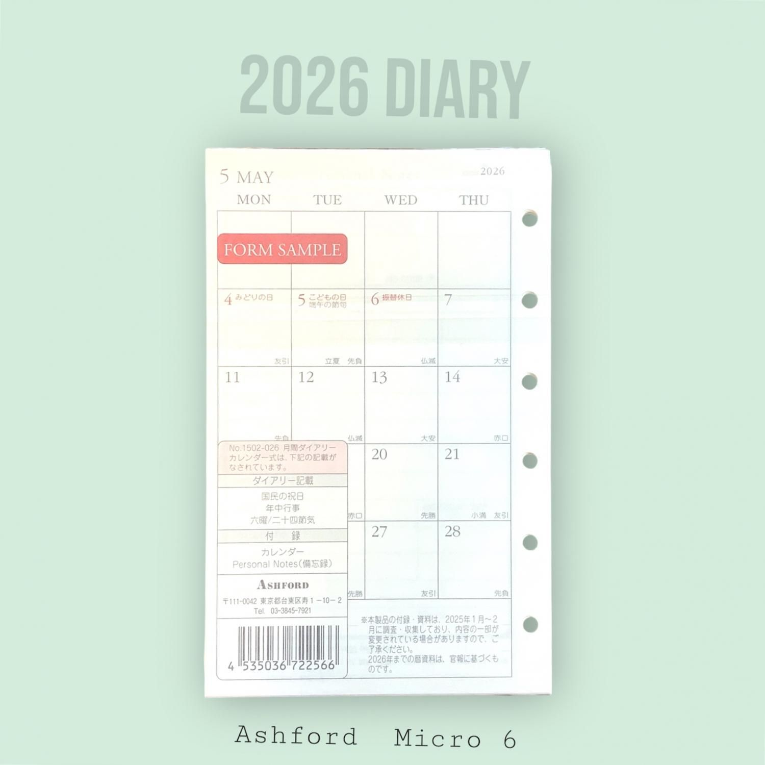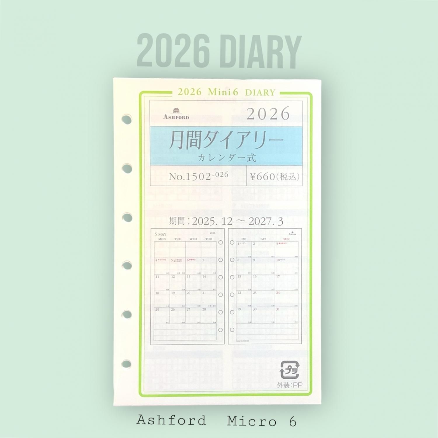 M6リフィル 2026年 月間ダイアリー(カレンダー式・月曜始まり)グレース紙 No.1502-026