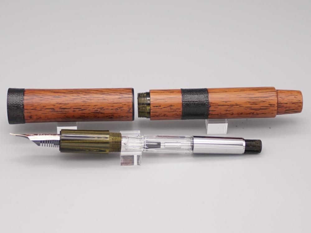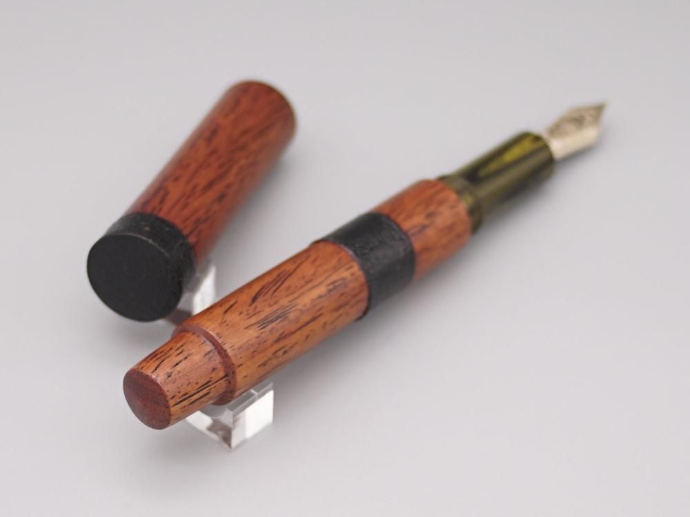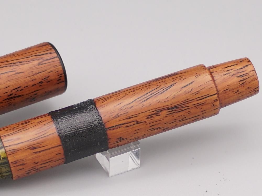 太軸の静謐万年筆に、塗師が拭漆を施し、キャップトップとボディ中央は布着の技法を用いています。