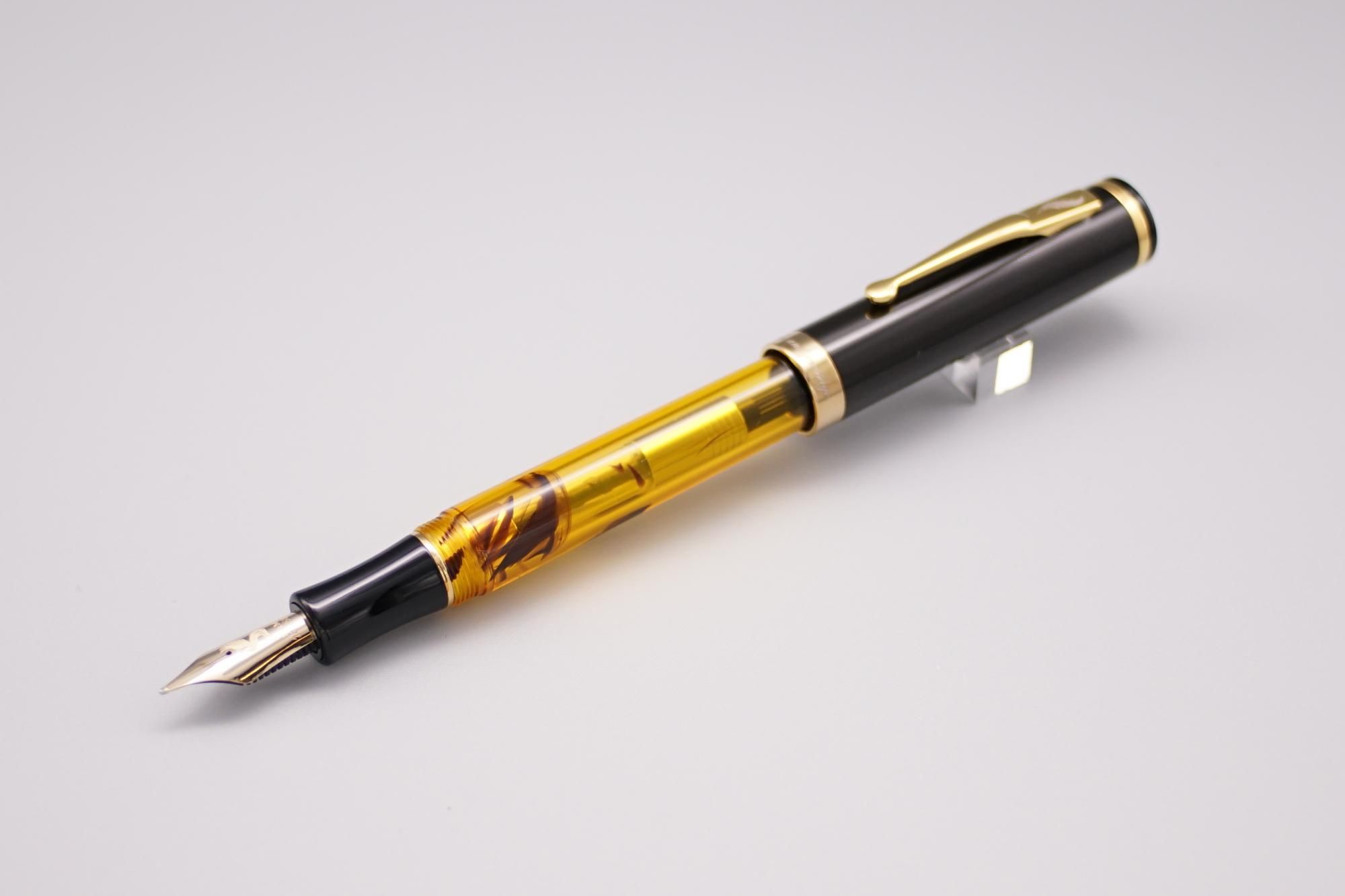 琥珀柄の軸は、廃番になっていた素材をこのペンのために再生産してもらったものを使用しています。インク残量が分かりやすく、実用的にも使いやすい軸です。