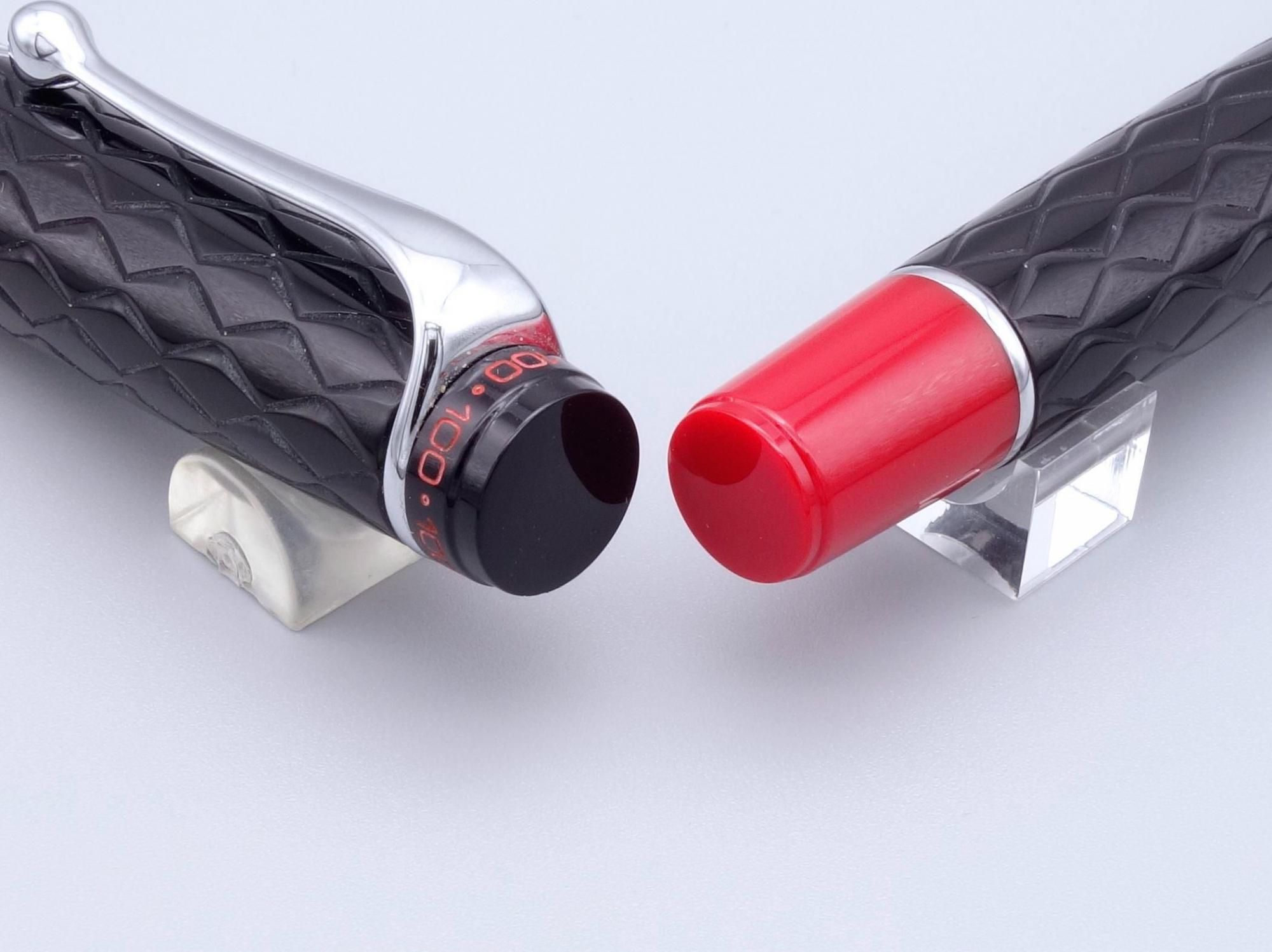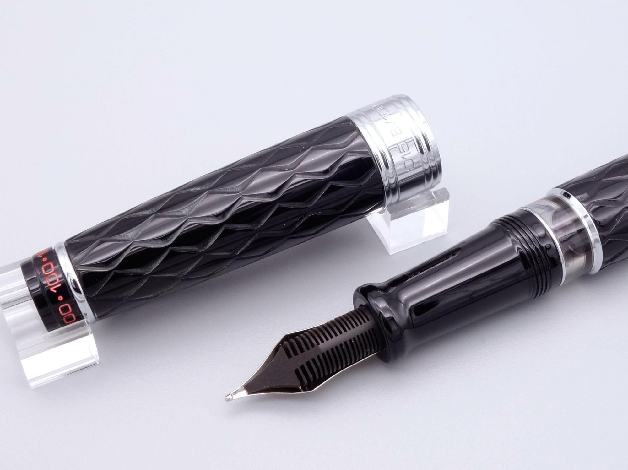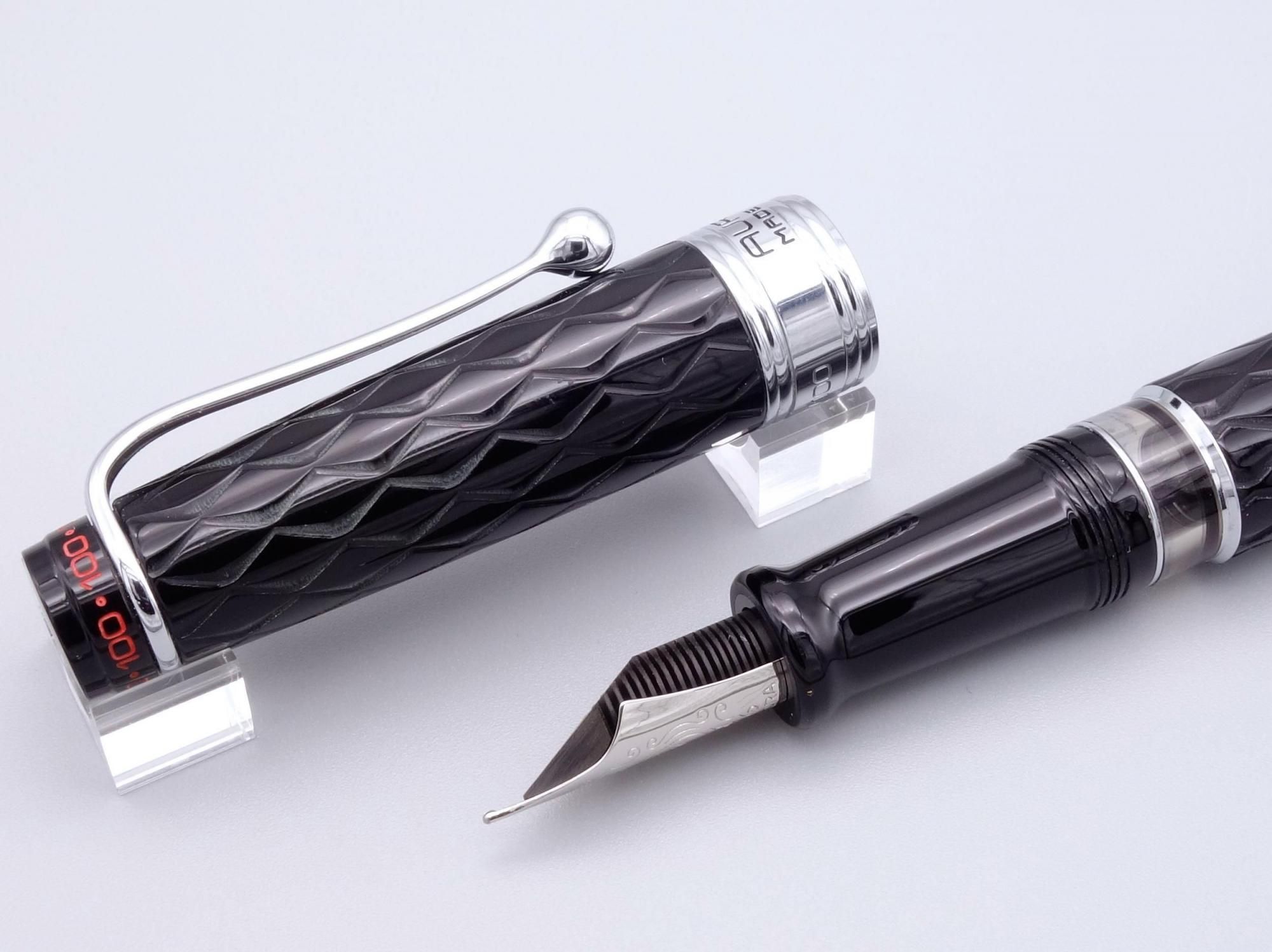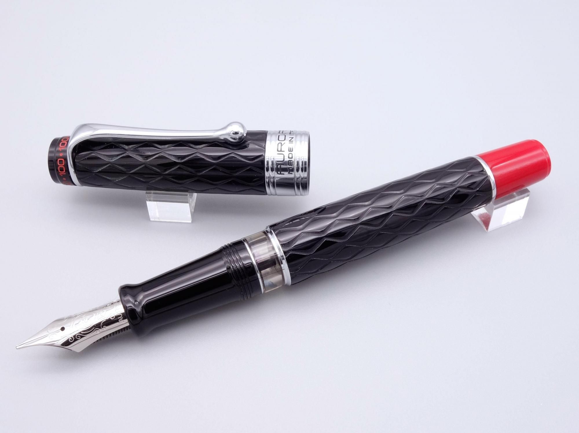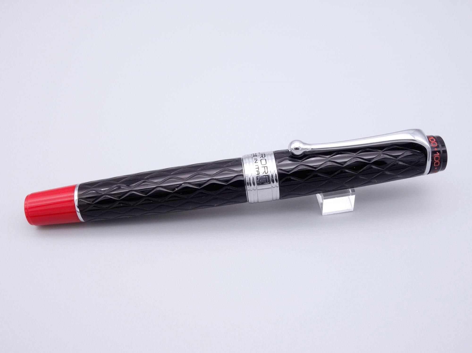 ボディに彫られたギロシェパターンや赤い尻軸、100の数字をデザインとして施した天冠や18金ペン先など特別仕様となっています。
