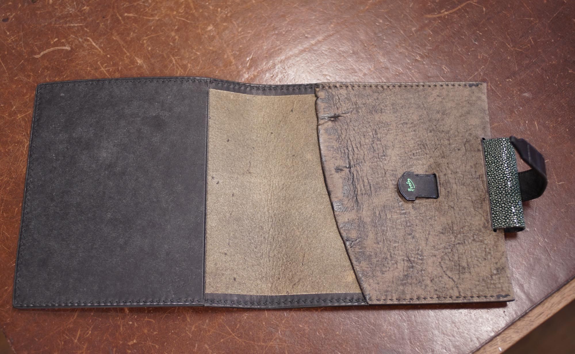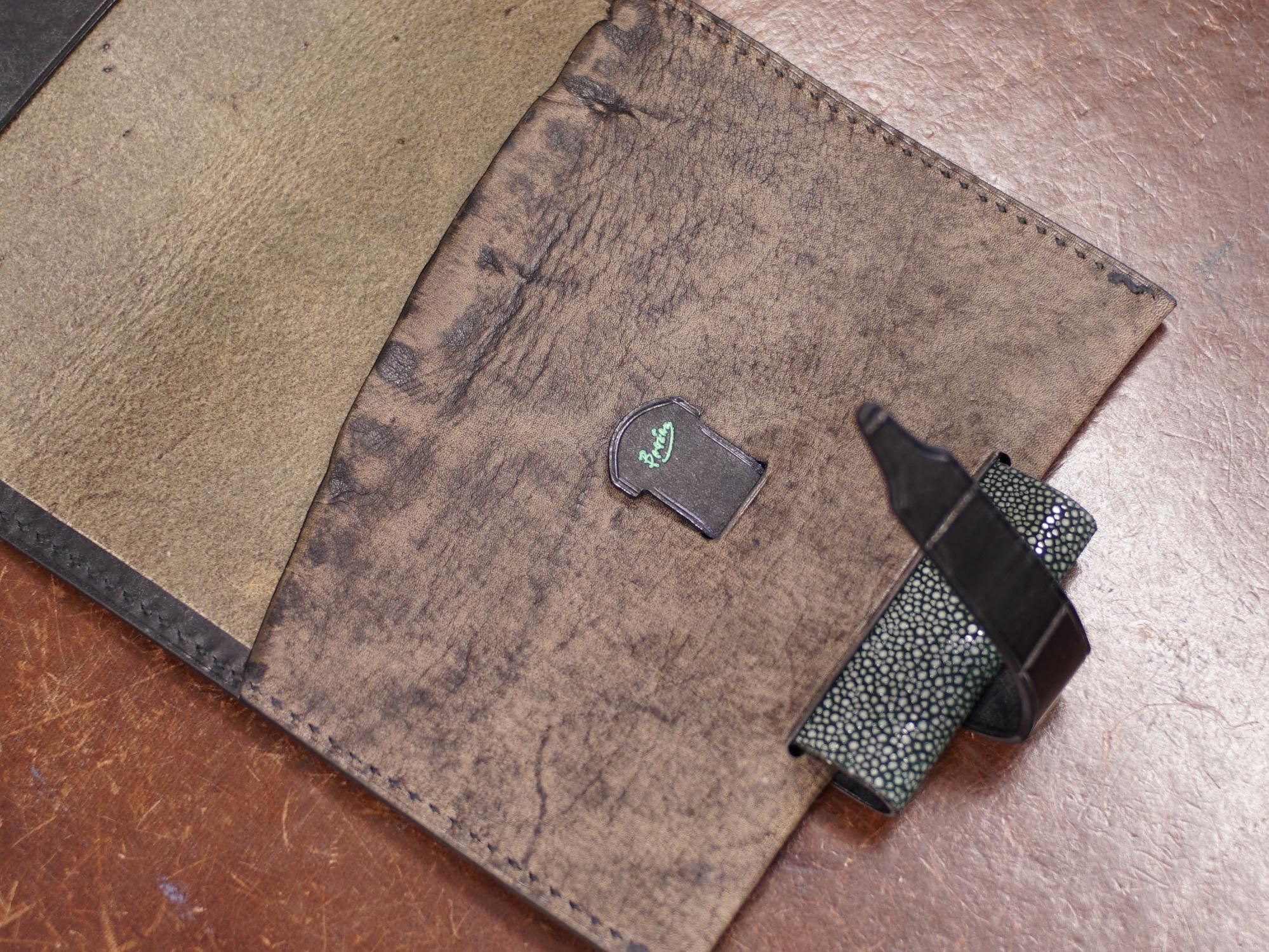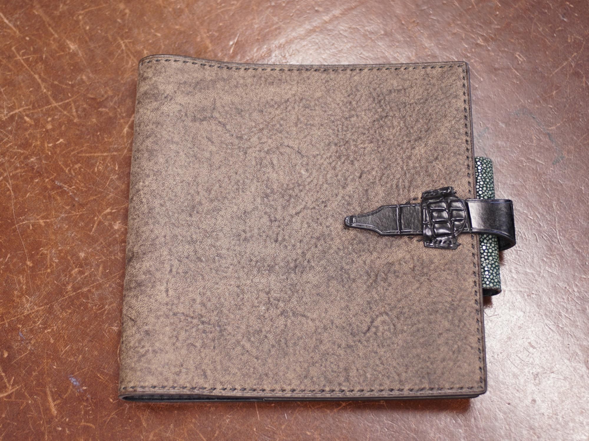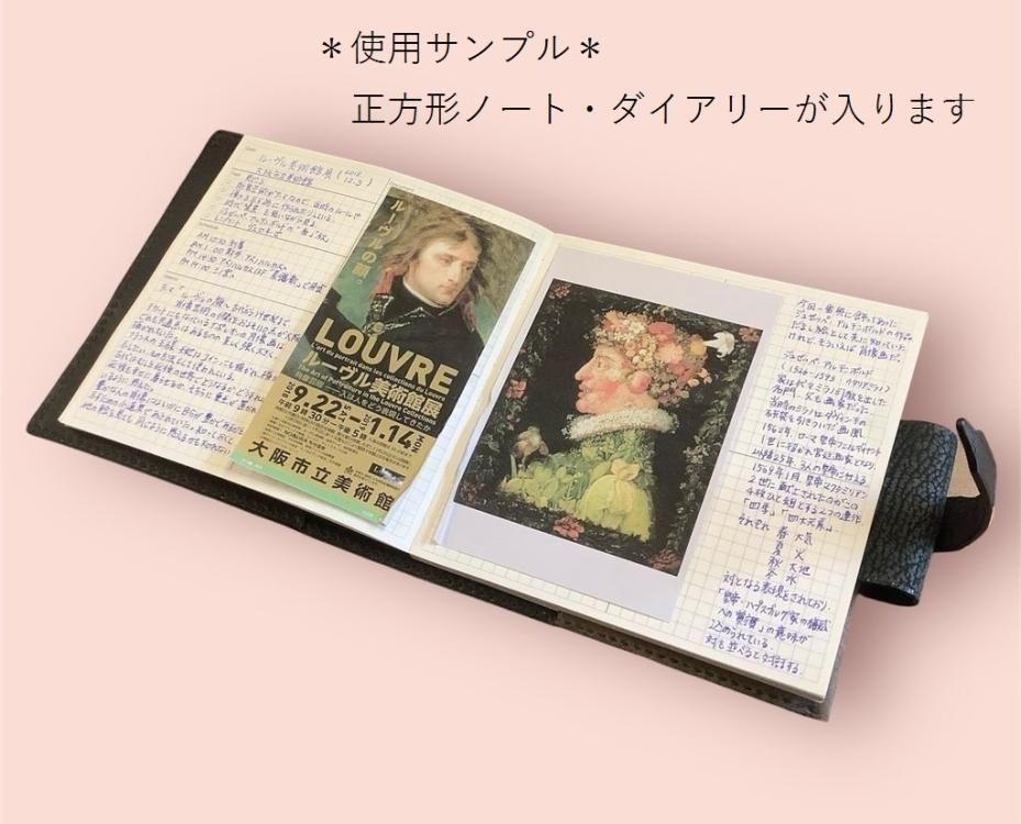 当店オリジナルの正方形のダイアリー、大和出版印刷の正方形ノート用の革カバーをバゲラさんに製作していただきました。