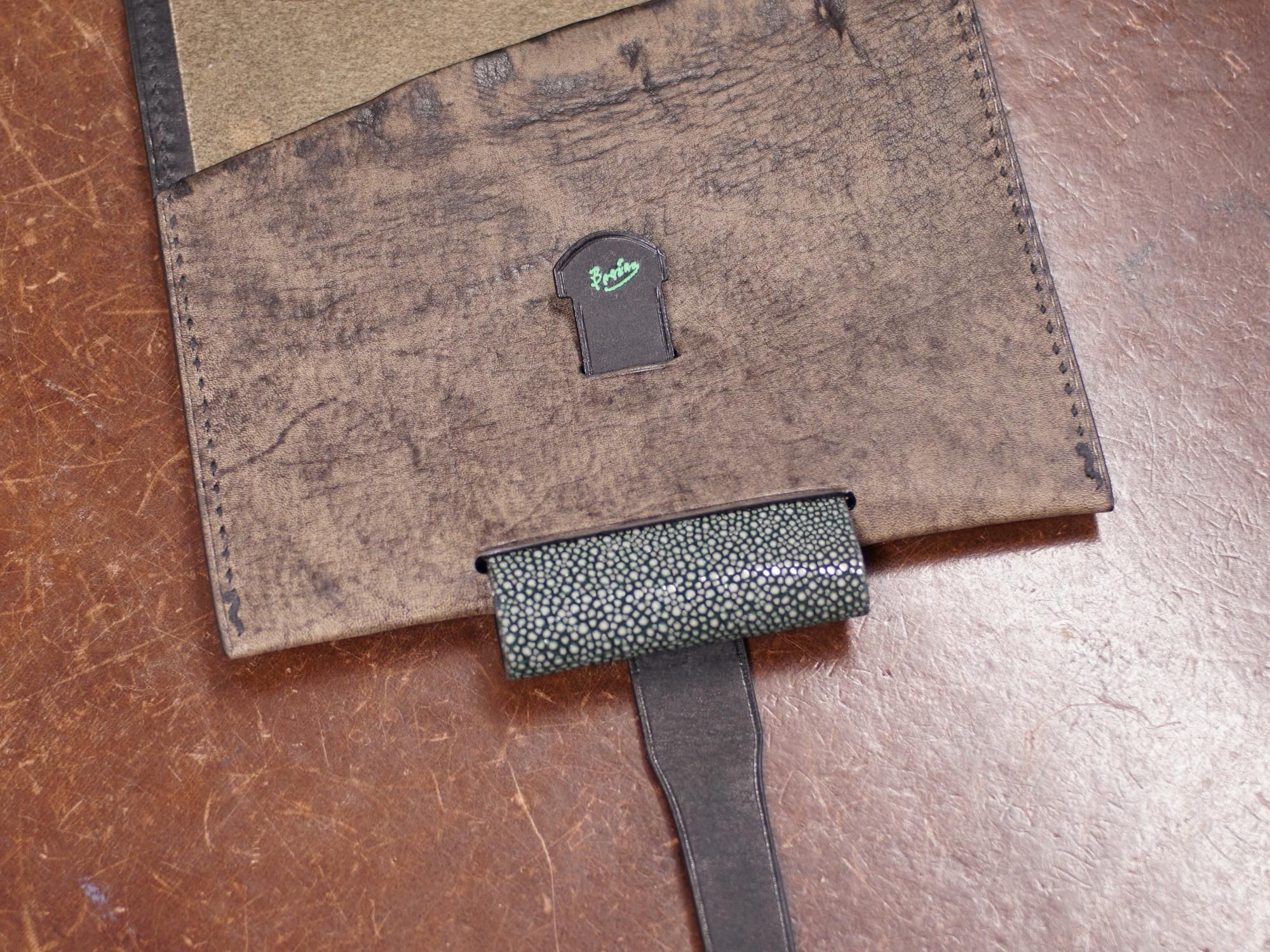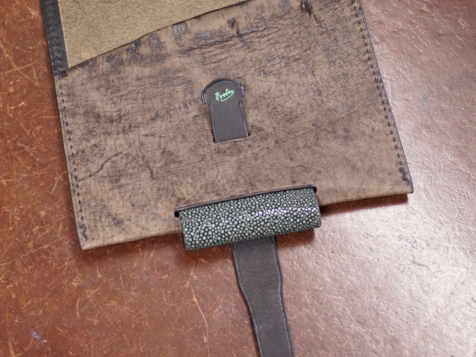 イタリアバタラッシィ社のアンティーク仕上げの牛革「ハバナ」をベースに、裏側の左部分はプエブロ革、右の折り返し部分は原革を活かしたラインになっています。