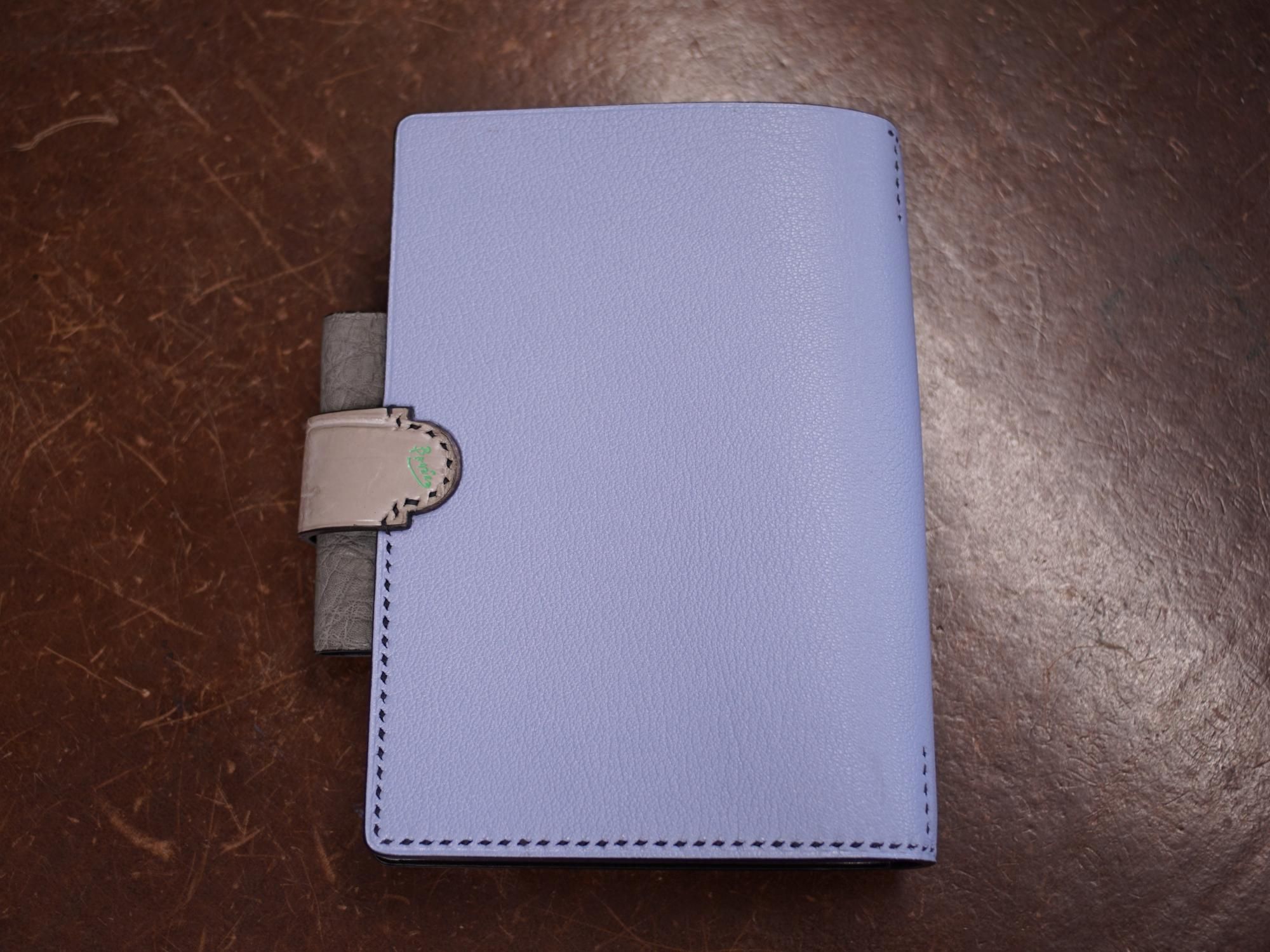 裏革にはブッテーロ革のパープルを使って、ベルトループと裏表紙に付いたポケットは手縫いのステッチで仕上げられています。